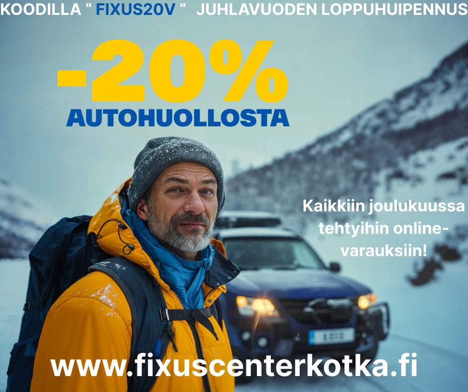 Nyt kaikki verkkoajanvaraukset -20% alekoodilla FIXUS20V vuoden loppuun saakka! Nappaa etusi huoltoon ja varaa aika online-ajanvarauksemme kautta. Huom. voit hyödyntää edun myös ensi vuodelle kunhan varaus on tehty 31.12.2025 mennessä !